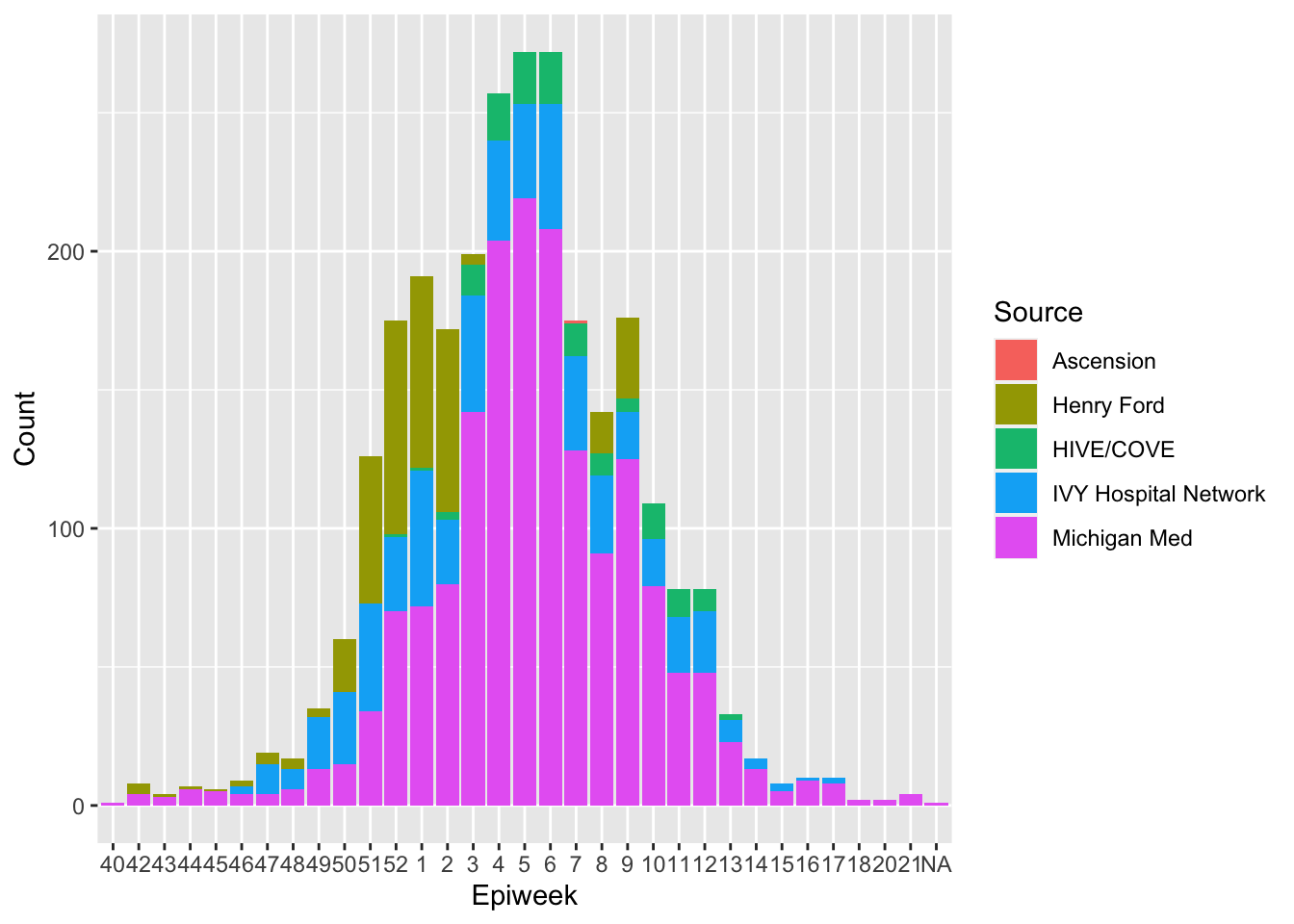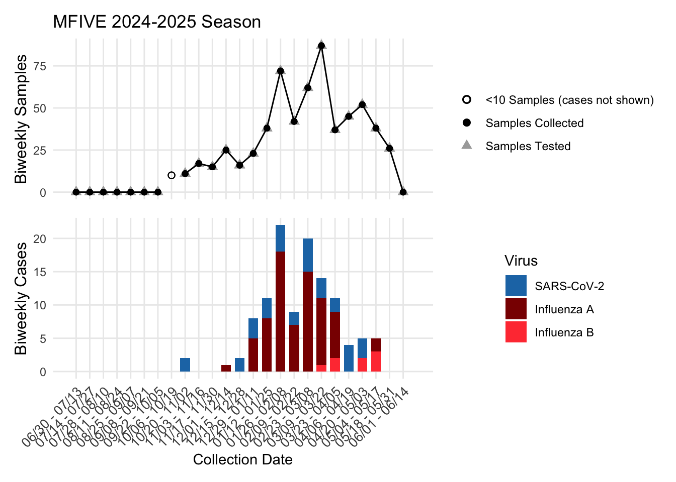 This CDC-funded study works in partnership with other national sites to conduct active surveillance of individuals with medically-attended acute respiratory illness (active since 2010). In collaboration with Dr. Ivana Vaughn of the Henry Ford Health System, the Center’s researchers work with ambulatory clinics across southeast Michigan to collect data on vaccine effectiveness against respiratory viruses. Along with the other sites in the network, they distribute and collect swabs and clinical data to monitor vaccine effectiveness, while evaluating the epidemiology, clinical characteristics, and risk factors for influenza and COVID-19 across the US. This study is part of the CDC’s US Flu VE Network. More information about the US Flu VE Network. The data provided below are biweekly samples, censored if the total samples taken for that period is <10. The last line of the file represents cumulative totals.