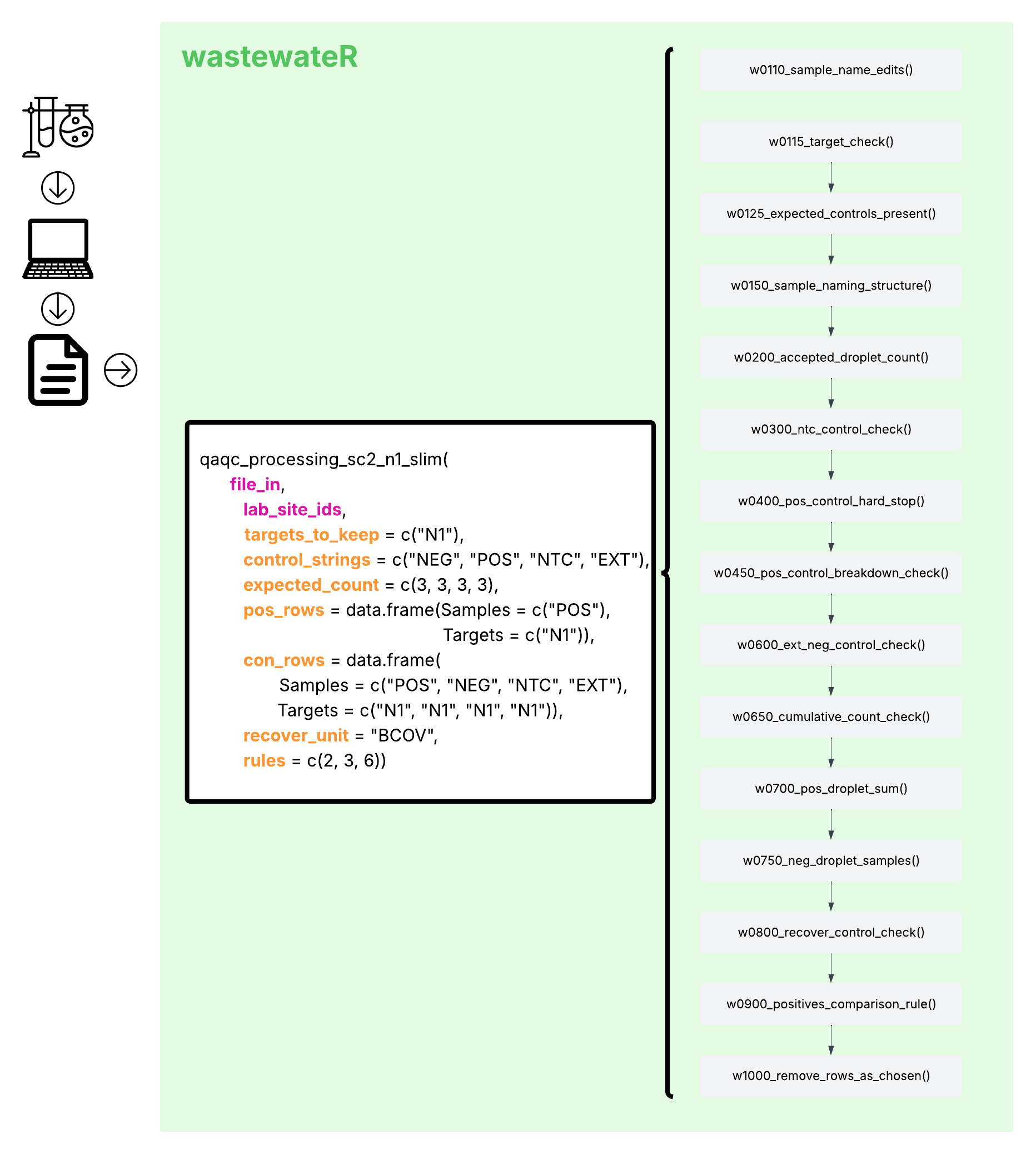 The wrapper functions are all intended as processing functions for a specific pathogen or set of pathogens. The idea is that the majority of the standard inputs and rules are set, and the user just needs to provide a small amount of information that is specific to their use-case (i.e. their data file, and their sample site identifiers). Most wrappers include additional flexibility, including the ability to change control naming conventions. If a user wanted additional flexibility beyond that, then they would need to string together the minor functions for their own use.